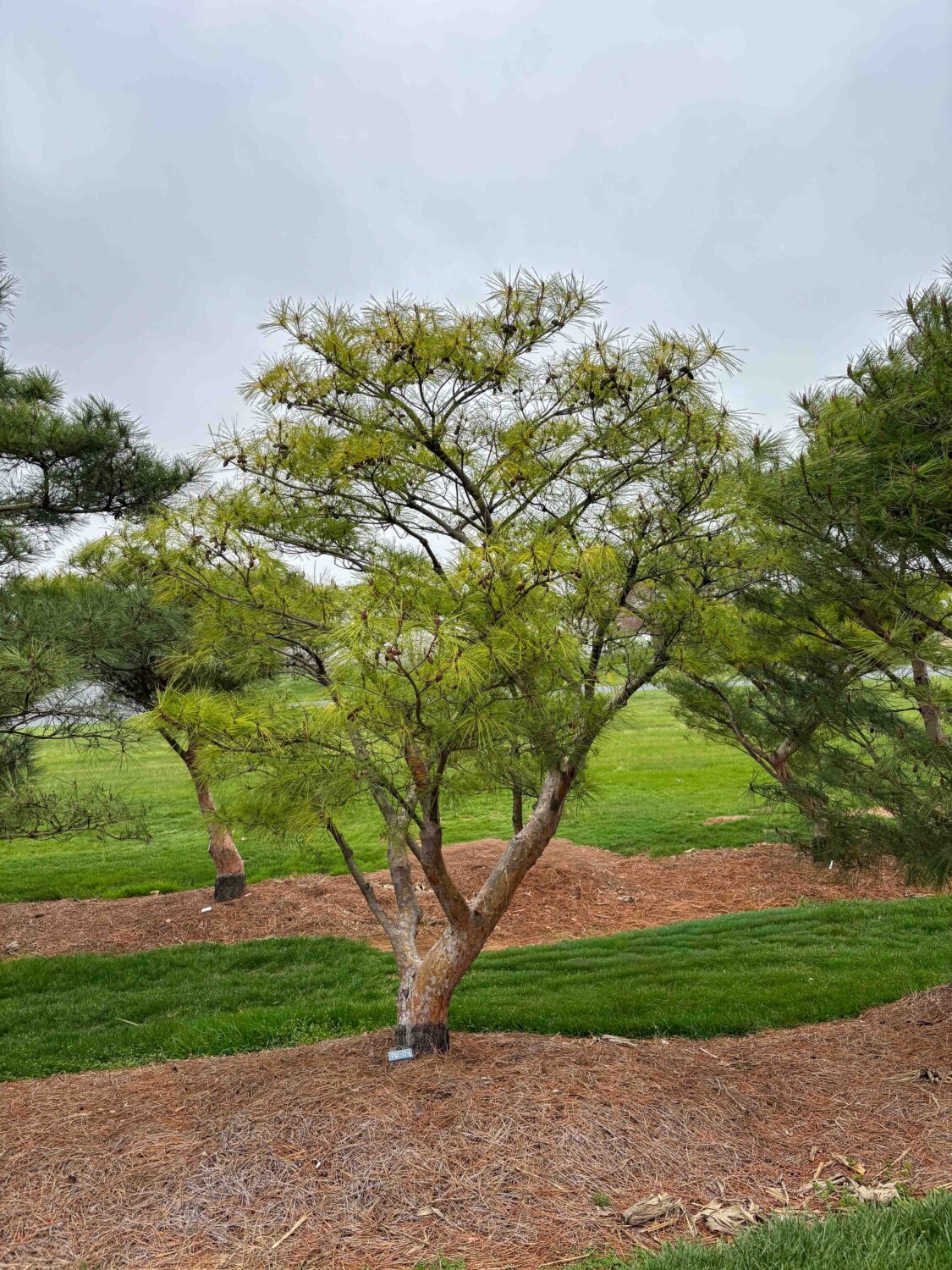 Pinus densiflora : Fast-growing Japanese Red Pine with exfoliating bark. Upright-growing, with a single trunk which we develop for character.